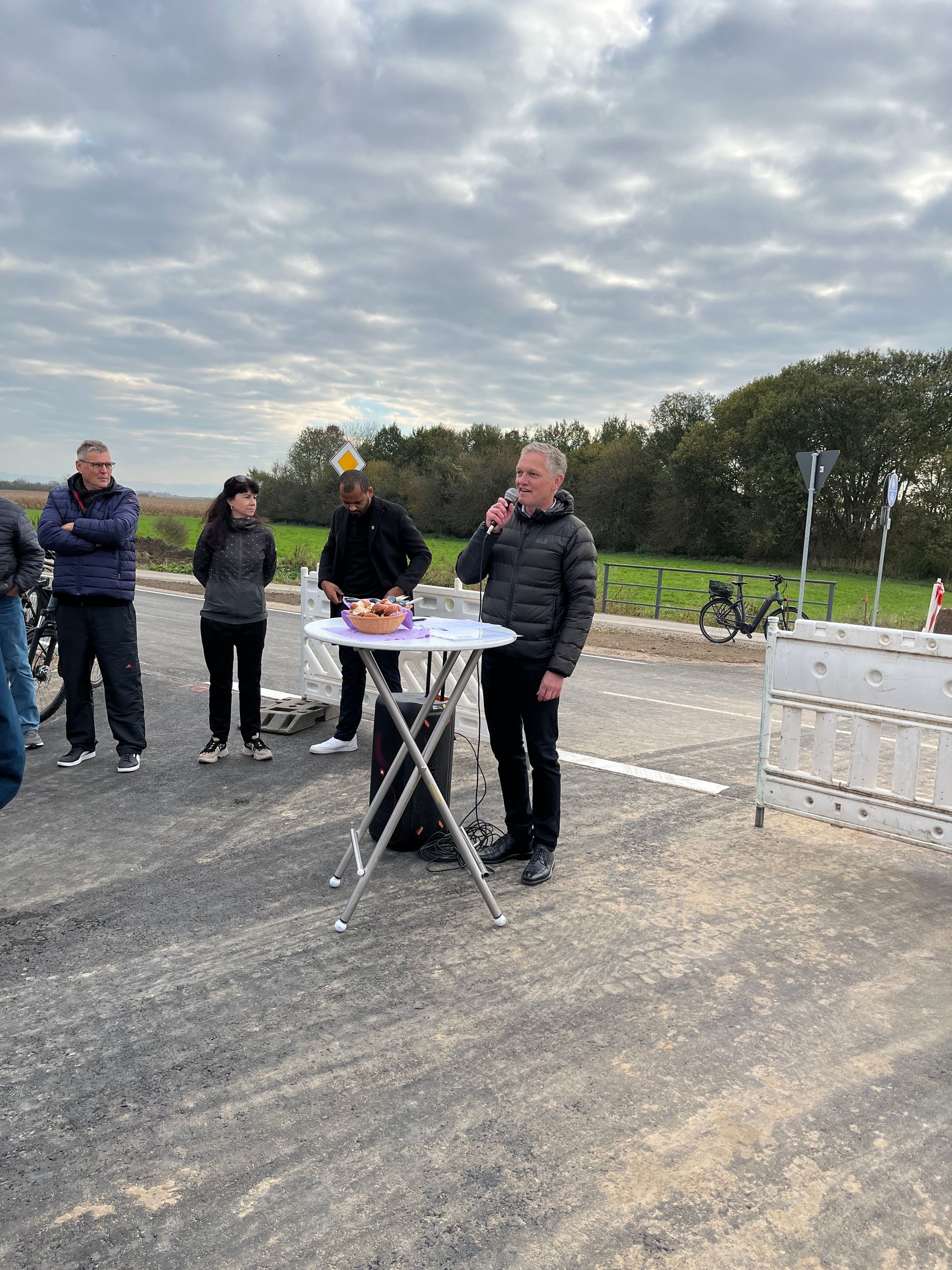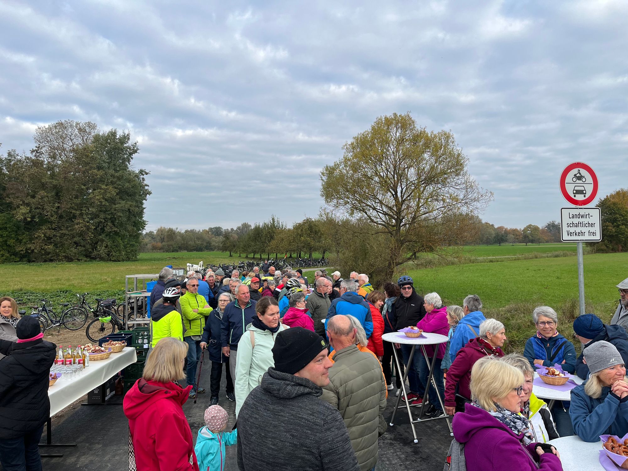 Heute war ich bei der offiziellen Eröffnung des Radweges von Wyhl nach Weisweil, ein Radweg entlang der L 104 für den ich mich ebenfalls über Jahre eingesetzt habe. Daher freute es mich sehr bei der Eröffnung dabei zu sein. 150 Radler/innen aus Wyhl und Weisweil sind der Einladung zur offiziellen Eröffnung des Radweges gefolgt und man traf sich an der Gemarkungsgrenze zwischen Wyhl und Weisweil am Muhrgraben. Die Straßenbauarbeiten, also die Begradigung der L 104 und dem parallel verlaufenden Radweg, wurden aufgrund von archäologischen Funden und damit verbundenen Grabungen verzögert. Bertram Jenisch vom Landesamt für Denkmalpflege hob hervor, dass die Geschichte von Wyhl wahrscheinlich etwas neu geschrieben werden muss. Bürgermeister Ferdinand Burger von Wyhl und stellv. Bürgermeister David Schönwälder von Weisweil dankten allen am Bau und an der Planung beteiligten Firmen. Mit der Fertigstellung dieses Radweges erweitert sich auch das RadNetz BW und die Attraktivität vom Auto auf das Fahrrad umzusteigen wird erhöht, dies ist ein Beitrag zur Mobilitätswende!