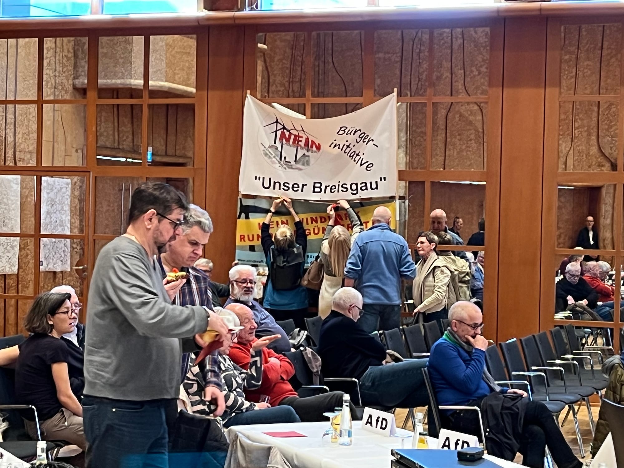Der Regionalverband stimmt mit großer Mehrheit für die 2. Offenlage der Teilfortschreibung Windenergie, gegen die Stimmen der AfD und bei wenigen Enthaltungen. Im Publikum waren auch Windenergiegegner, die ihren Protest zu der 2. Offenlage kund taten.